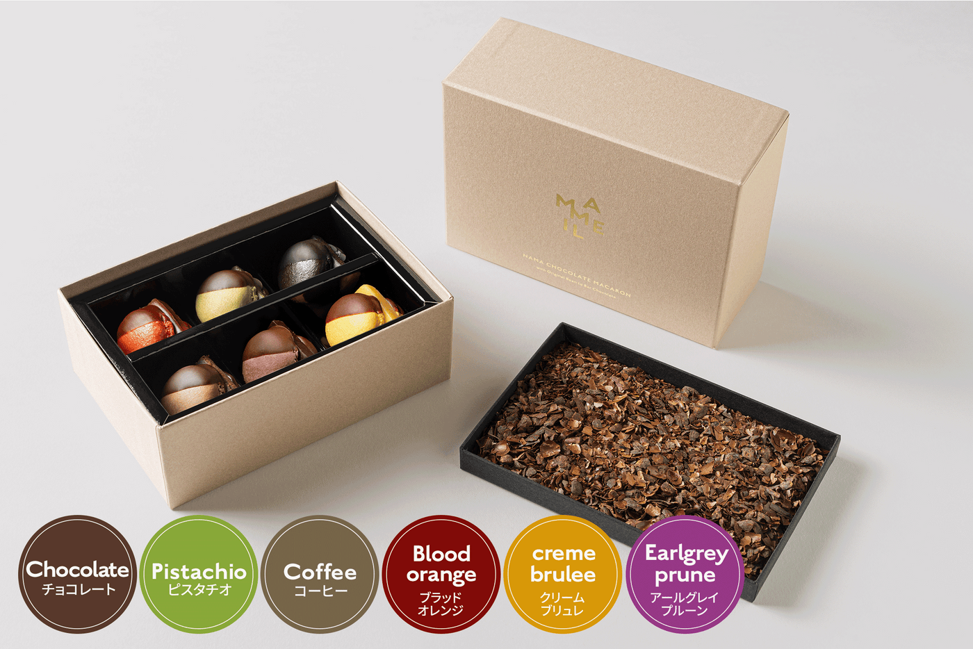 今回ご紹介するのは、「MAMEIL NAMA CHOCOLATE MACARON - Chocolate / Pistachio / Coffee / Blood orange / Creme brulee / Earl grey prune -(6個入)」。価格は**¥3,700(税込)**で、完成された6種類のフレーバーを少しずつ楽しめる贅沢なセットになっています。